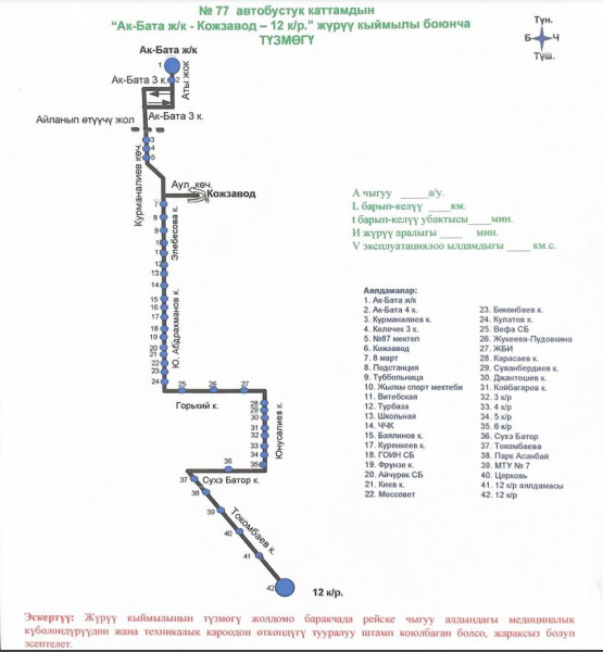 Автобус № 17Т переименован в № 77 в связи с тем, что пассажиры путали схемы движения маршрутов № 17 и № 17Т. Ранее автобус № 17Т курсировал по маршруту Кожзавод — 12-й микрорайон. Теперь маршрут продлевается по улице Курманалиева до жилмассива «Ак-Бата» и будет курсировать под № 77, следуя по новому маршруту жилмассив «Ак-Бата» — Кожзавод — 12-й микрорайон.