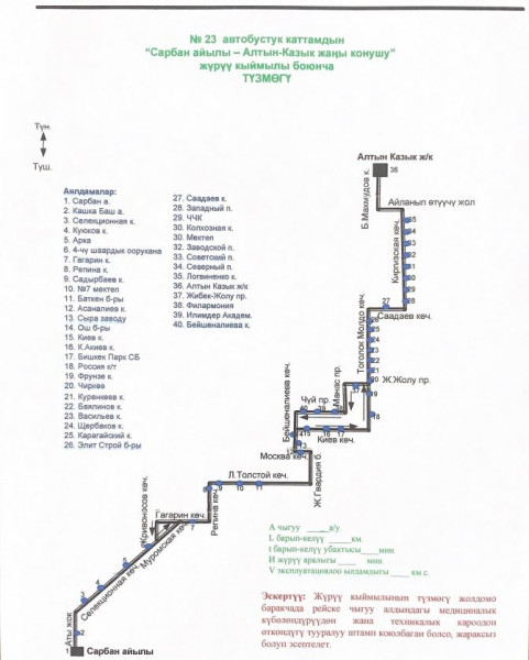 Автобус № 23, ранее курсировавший по маршруту село Сарбан — жилмассив «Ак-Бата», изменяет конечную остановку: вместо этого жилого массива теперь будет следовать до жилмассива «Алтын-Казык». Кроме того, движение по улице Курманалиева заменяется на движение по улице Киргизия, и автобус теперь будет следовать по маршруту село Сарбан — жилмассив «Алтын-Казык».