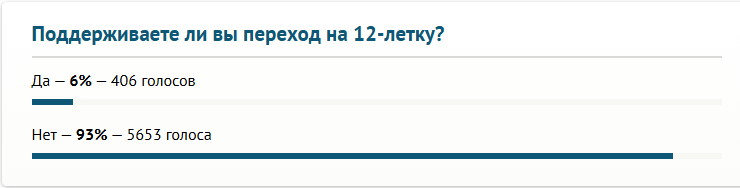 Подавляющее большинство участников опроса — 93 процента, или больше 5,6 тысячи голосов — не поддерживают реформу. Лишь 6 процентов респондентов отдали свой голос в поддержку трансформации школьного образования.