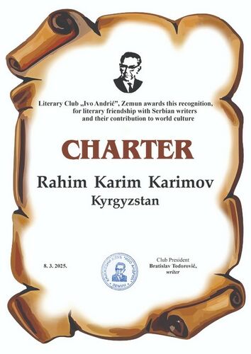 Как указано в дипломе, награда присуждена Рахиму Кариму «за литературную дружбу с сербскими писателями и его вклад в мировую культуру».