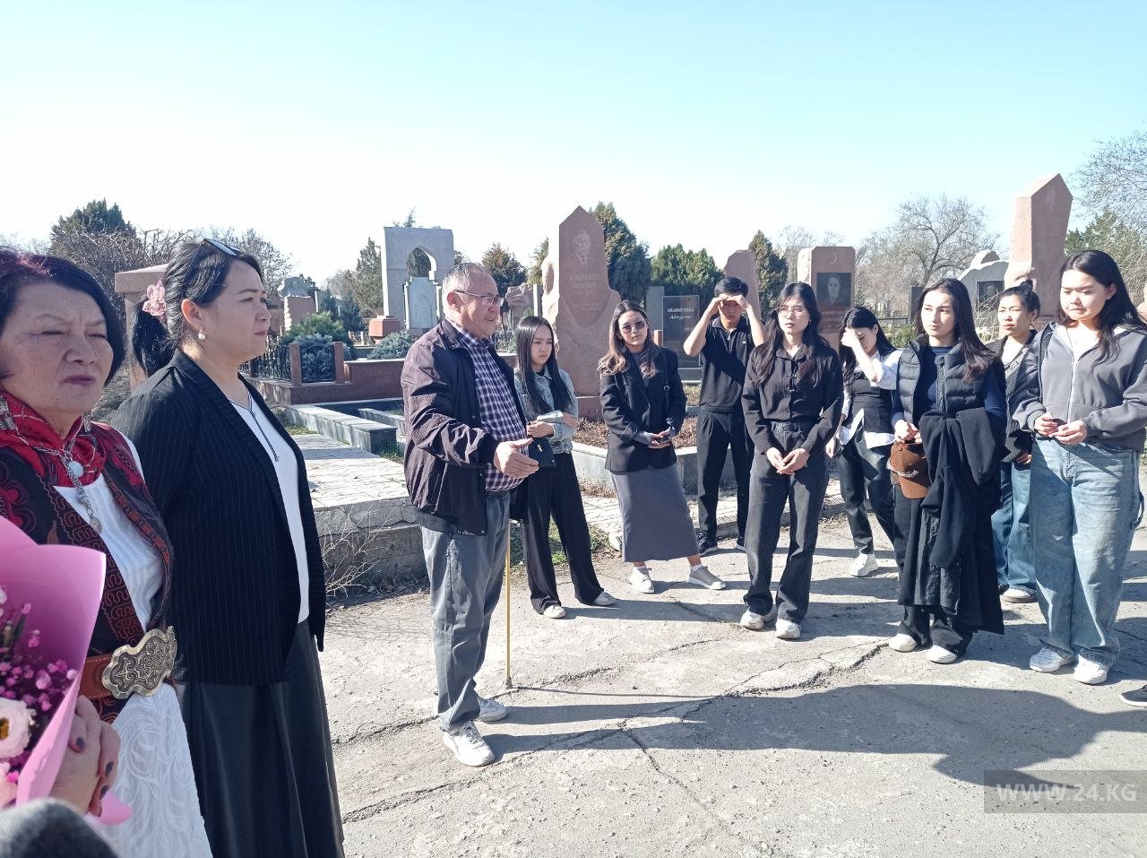Студенты и преподаватели возложили цветы к могиле Алыкула Осмонова и прочитали молитву.