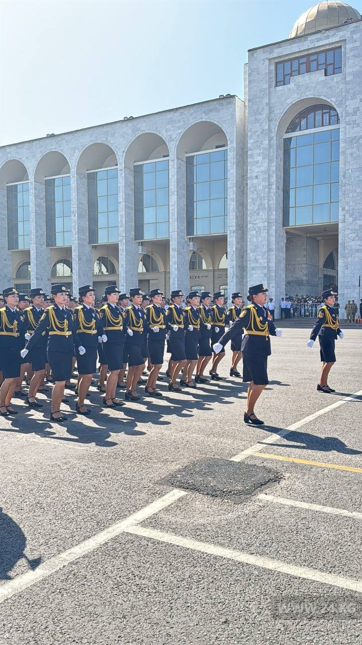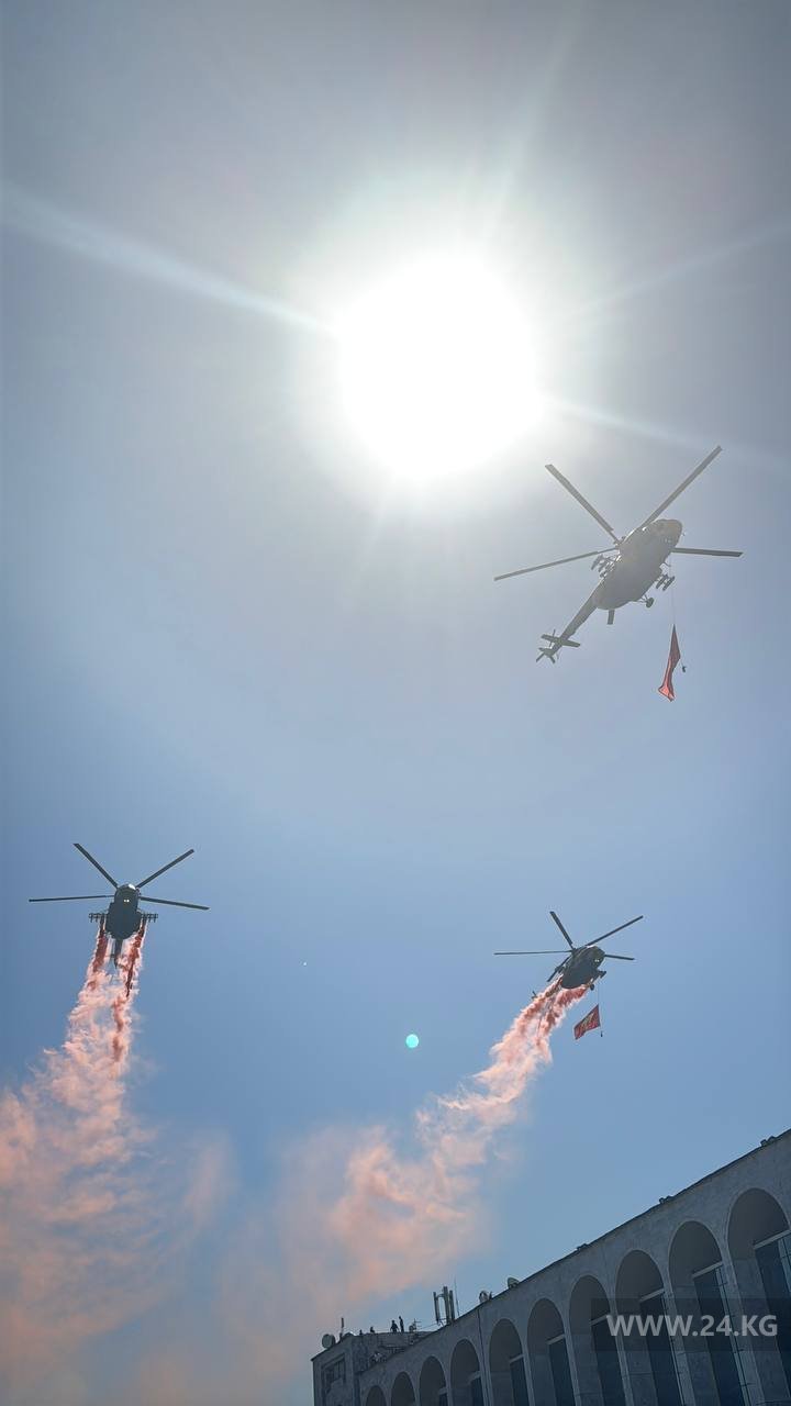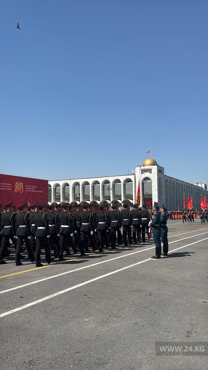В начале мероприятия президент Садыр Жапаров возложил цветы к Вечному огню на площади Победы, после чего прибыл на центральную площадь. Там он поздравил собравшихся с 80-летием Победы в Великой Отечественной войне и дал старт параду.