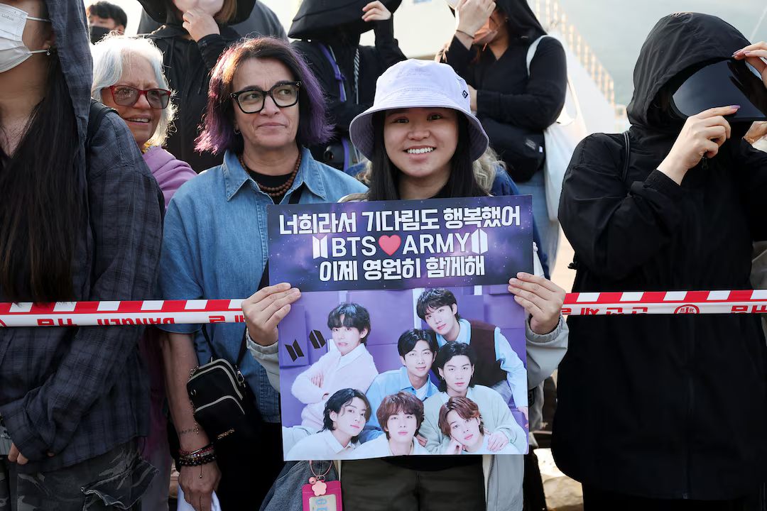 Вчера участники RM и V поприветствовали фанатов, которые специально приехали на встречу из разных стран, исполнив им мелодии на саксофоне. Артистов встречали с цветами и плакатами возле штаб-квартиры Hybe в центре Сеула. Они попросили подождать фанатов еще немного до полного воссоединения группы.