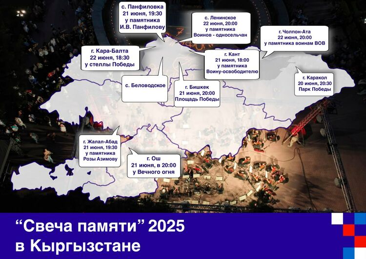 Жители городов Бишкека, Оша, Джалал-Абада, Каракола, Чолпон-Аты, Кара-Балты, Канта, а также сел Панфиловское, Ленинское и Беловодское соберутся, чтобы почтить память павших солдат и мирных жителей, отдавших жизни за свободу в годы войны.