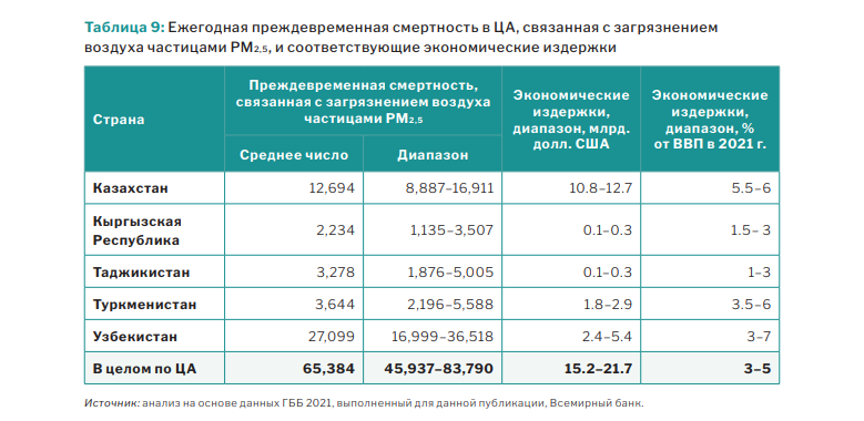Общий ущерб для здоровья населения, вызванный загрязнением воздуха PM2,5, в ЦА составляет $15,2–21,7 миллиарда в год.Вместе с тем уровень финансирования мер по борьбе с загрязнением воздуха в мире остается крайне низким.