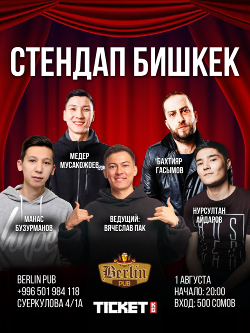 Меткие шутки, харизматичные комики и отличное настроение — все, что нужно для идеального летнего вечера. На сцене Манас Бузурманов, Нурсултан Айдаров, Медер Мусакожоев, Бахтияр Гасымов.