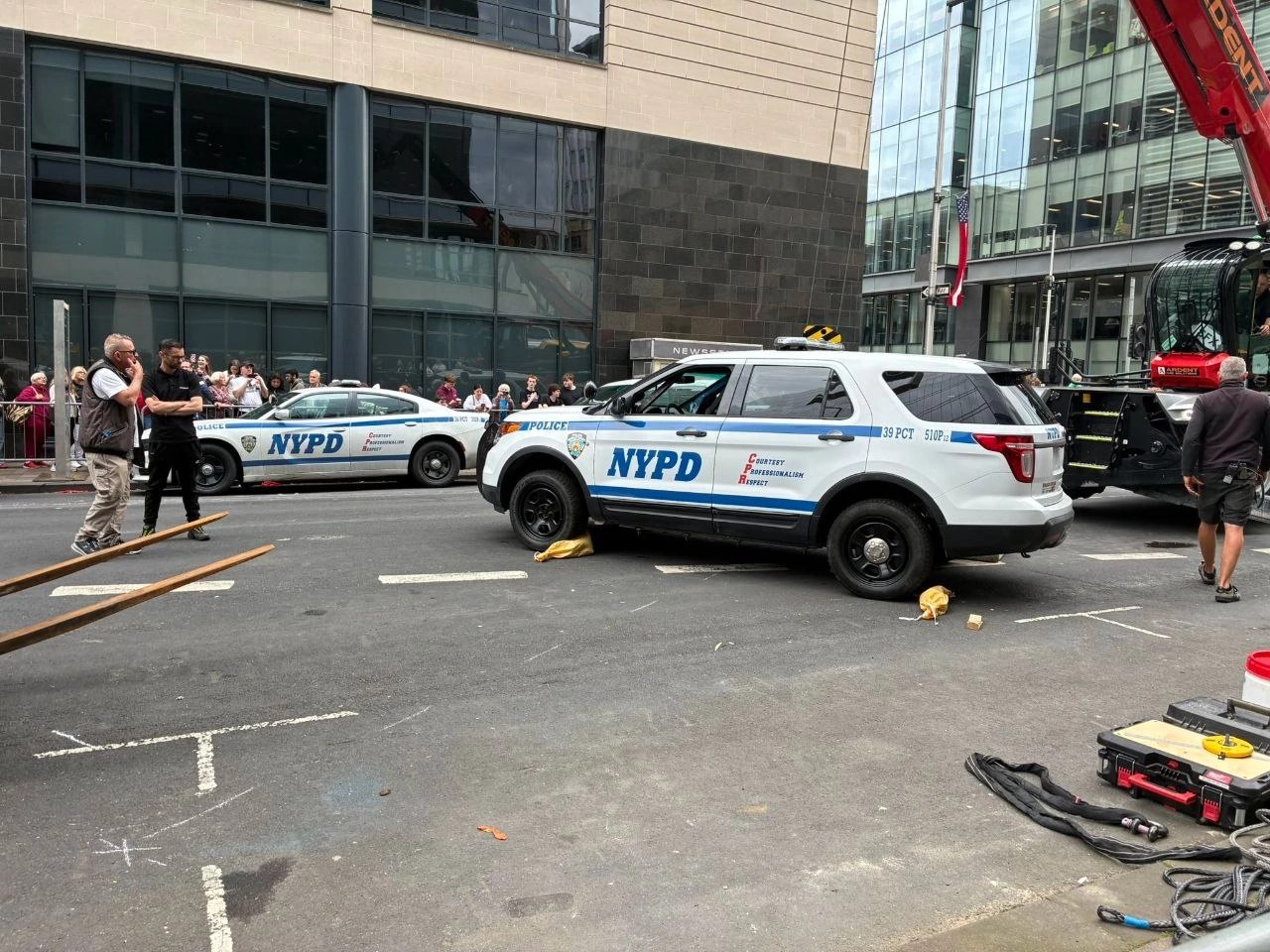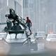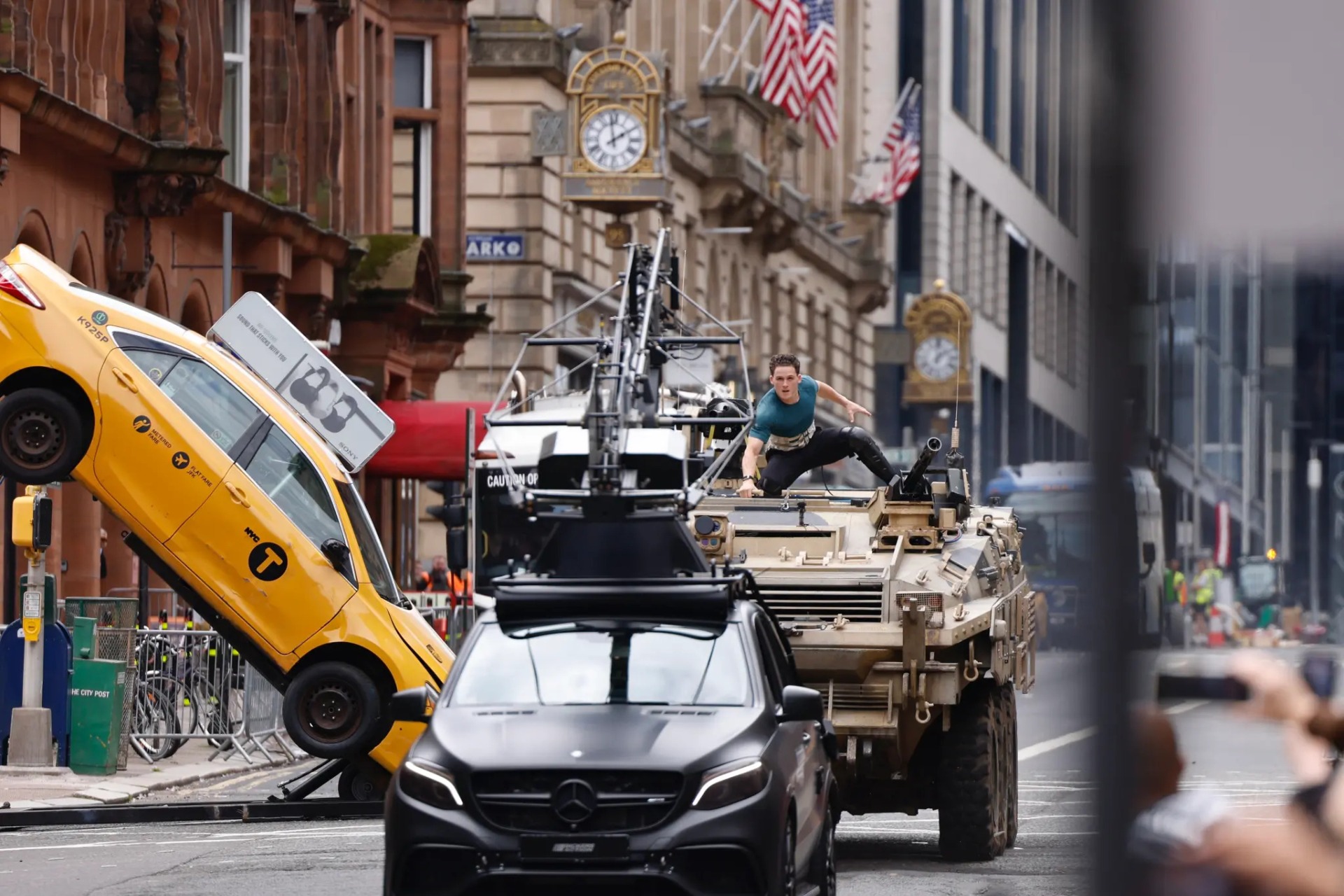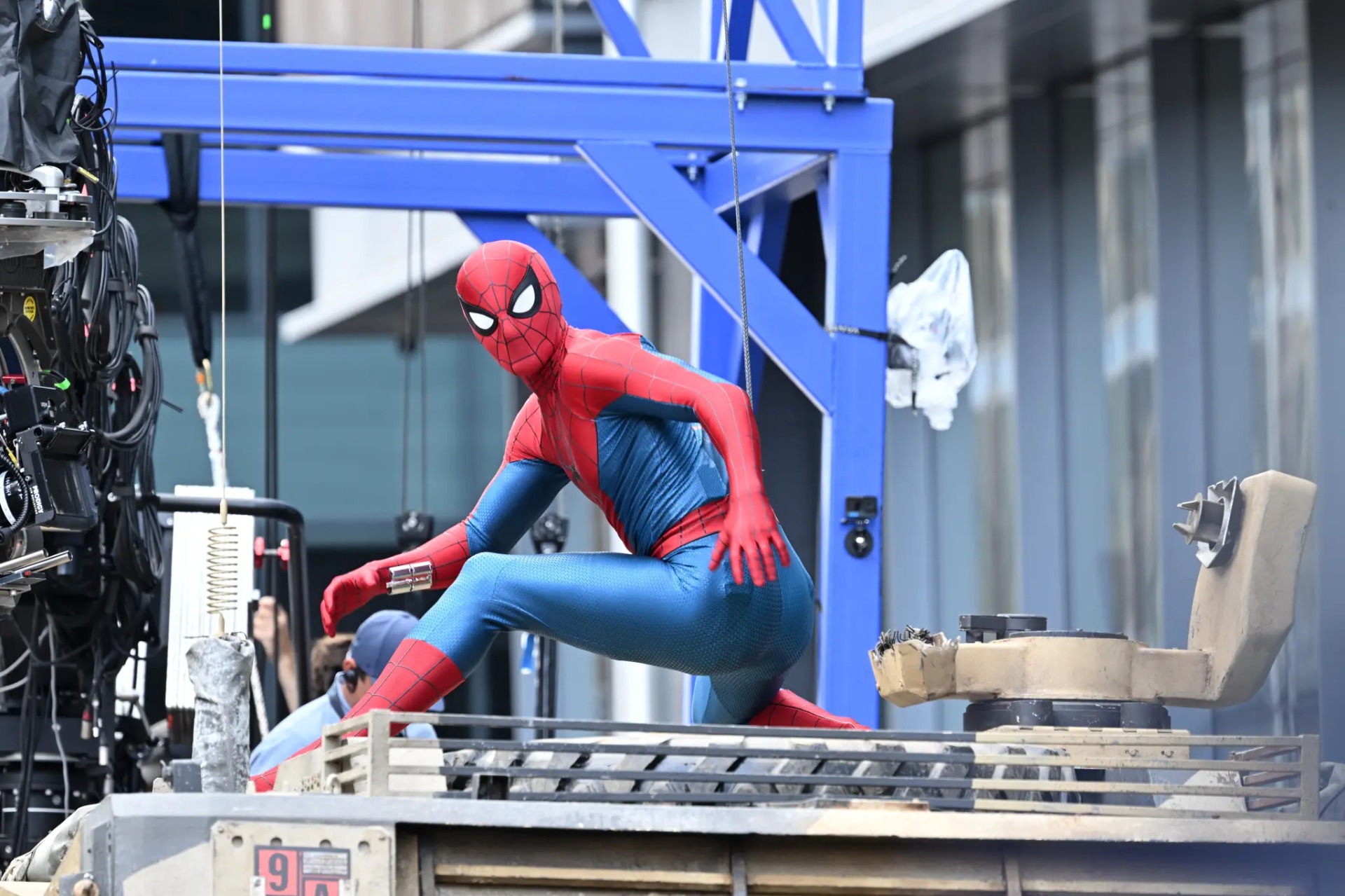 На фотографиях видно, как Том Холланд в новом костюме на бронированной машине исполняет трюки.
