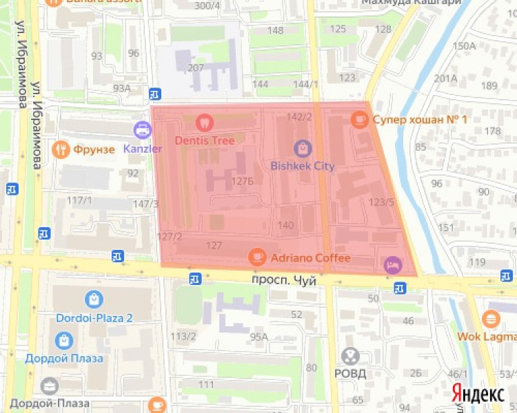 Район отключения, ограничен улицами: проспект Чуй — улица Гоголя — улица Огонбаева — улица Осмонкула.