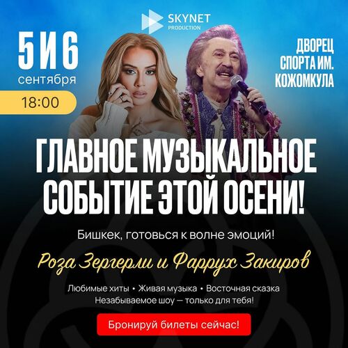 На одной сцене выступят легендарный Фаррух Закиров и неповторимая Роза Зергерли. Вас ждут восточная магия, любимые хиты и эмоции, которые останутся в сердце надолго.