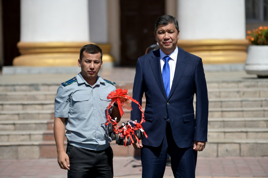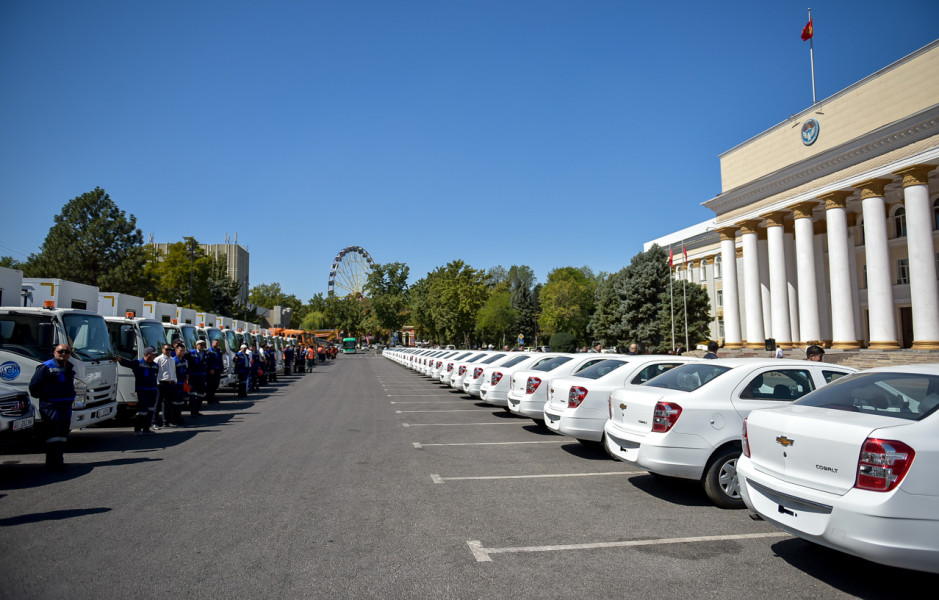 Так, для муниципальных предприятий «Бишкекводоканал» (21), «Бишкекасфальтсервис» (16), «Бишкекгорлифт» (2), «Бишкекский городской транспорт» (6), муниципальной инспекции (20) и управления по контролю за землепользованием (10) передали 75 единиц спецтехники, среди которых автовышка, самосвал, эвакуатор, погрузчик, водовоз, а также служебные машины Chevrolet Cobalt и пикап.