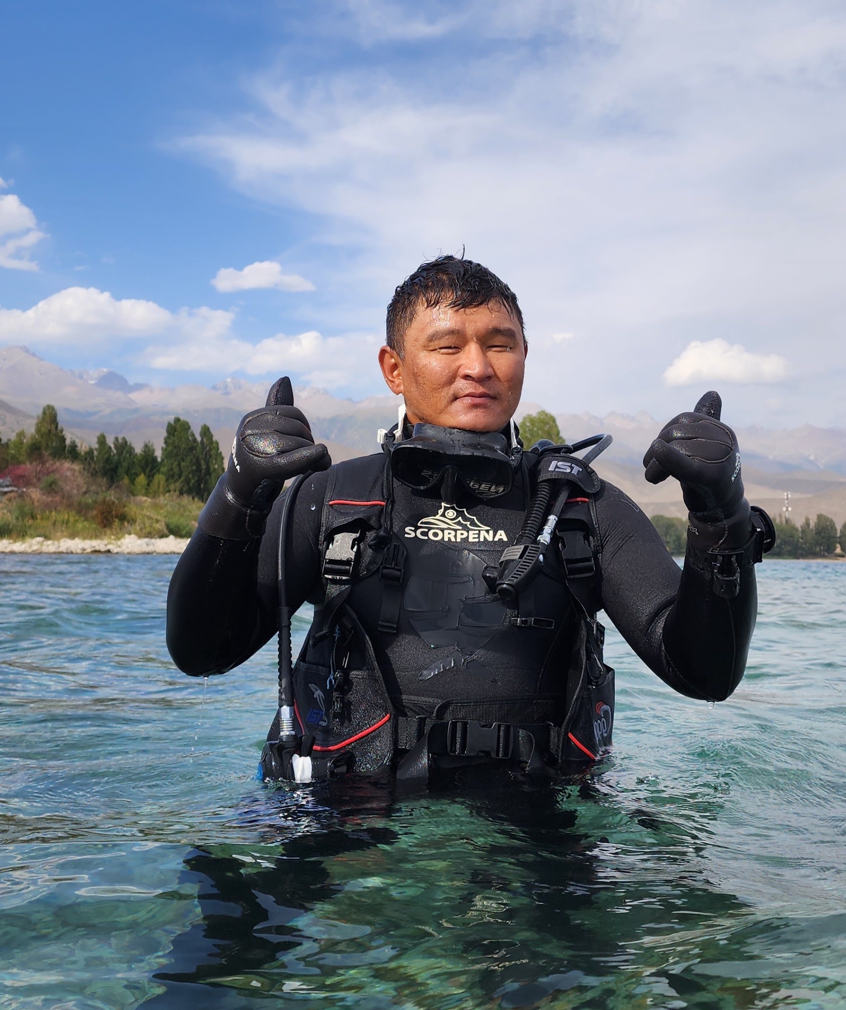 «Когда я уже сертификаты свои получил, приехал в Кыргызстан, и очень хотел стать глубоководником, у меня была водолазная книжка третьей группы специализации. Тогда еще вышел указ президента о масштабном очищении озера. И мы [водолазы МЧС] очищали Николаевский залив, Липинку, Каракол, пристань и маяк», — рассказал Бекжан.