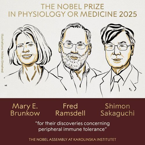 Нобелевскую премию в области физиологии и медицины за 2025 год получат Мэри Брунков, Фред Рамсделл и Симон Сакагучи. Об этом сообщается на сайте Нобелевского комитета.