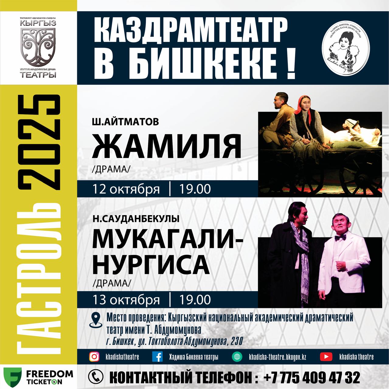 Коллектив театра 12 и 13 октября представит свои спектакли на гастролях в Бишкеке. Зрителям будут показаны драма «ЖӘМИЛӘ» («Джамиля») по произведению писателя Чингиза Айтматова, а также постановка «МҰҚАҒАЛИ—НҰРҒИСА» заслуженного деятеля Республики Казахстан Нартая Сауданбекулы, посвященная 100-летию Нургисы Тилендиева. Каждый спектакль — это синтез подлинных сценических эмоций, актерского мастерства и художественного поиска», — отмечается в сообщении.