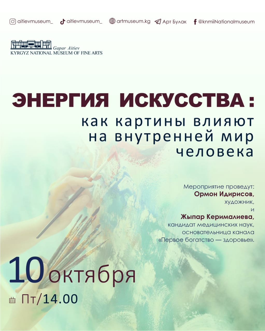 10 октября в Национальном музее изобразительных искусств имени Гапара Айтиева пройдет встреча на тему «Пространство внутренней гармонии». Об этом 24-kg.com сообщили в музее.