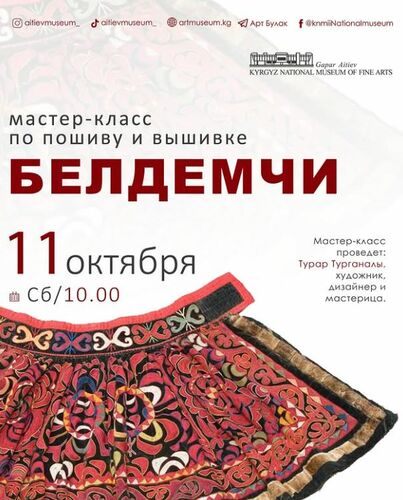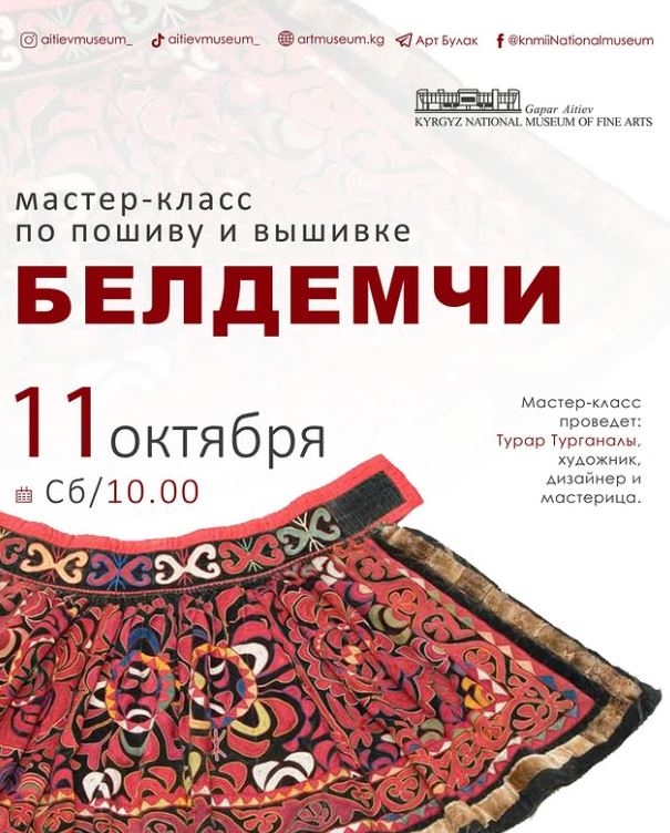 В месяц открытых дверей в музеях страны КНМИИ проведет мастер-классы по линогравюре и по пошиву и вышивке пояса белдемчи, также состоится лекция Айны Молдохматовой. Будут и обзорные экскурсии.