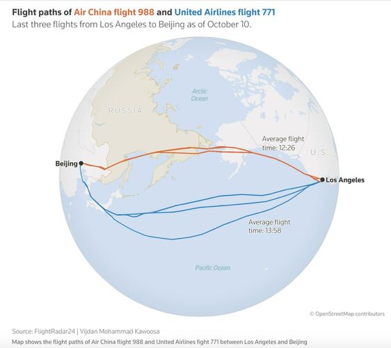 Отмечается, что Министерство транспорта предлагает запретить китайским авиакомпаниям использовать российское воздушное пространство на пассажирских маршрутах Китай — США, поскольку сокращение времени полета, которое дает такая практика, ставит американских перевозчиков в невыгодное положение.