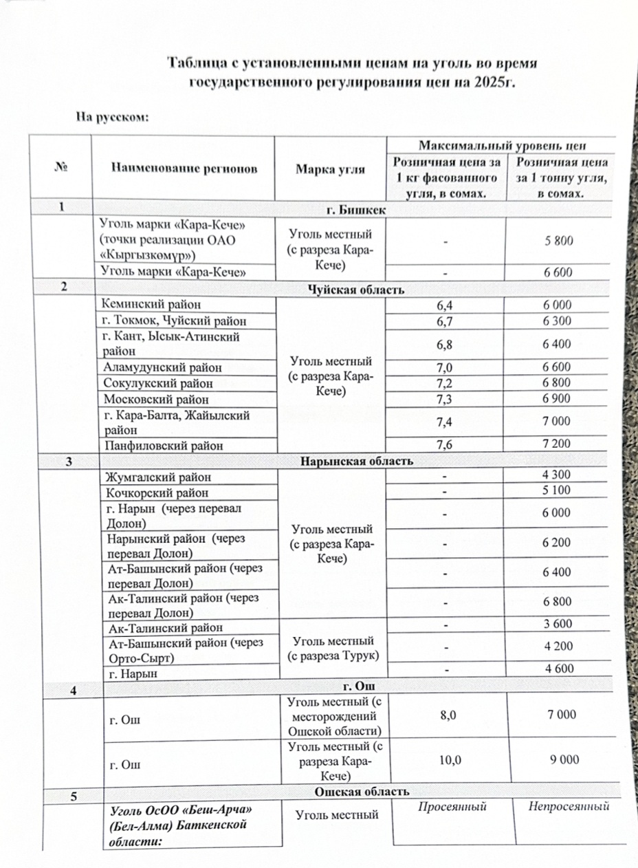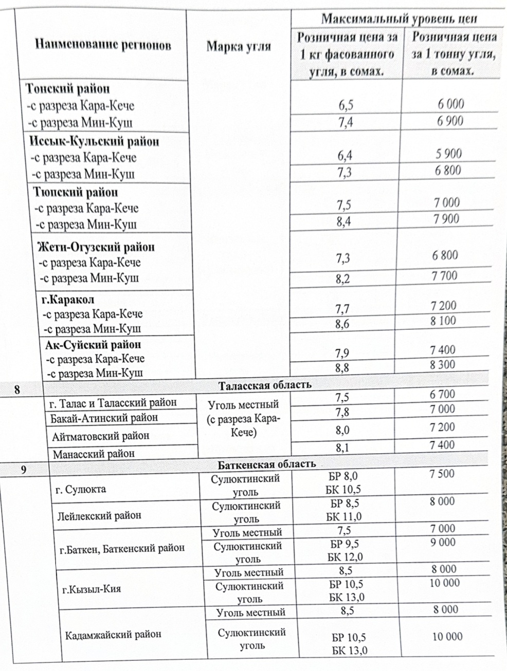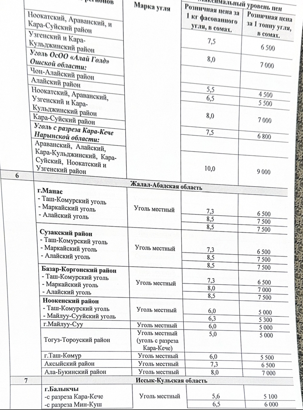 - в Чуйской области жители могут приобрести твердое топливо за 6—7,6 тысячи сомов за тонну (с разреза Кара-Кече);