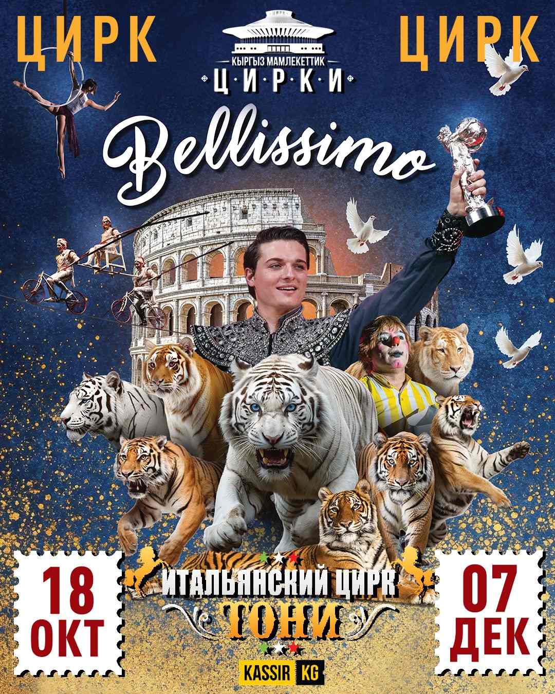 Из самого сердца Европы впервые в Кыргызстане выступит итальянский дуэт Флавио и Бруно Тони. Вас ждут уникальные розовые и белые тигры, воздушное импасато, смелые канатаходцы, полет акробатов под куполом цирка, жонглеры, ярчайшие попугаи и клоун из Латинской Америки.