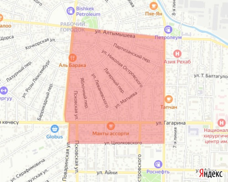 Район отключения, ограниченный улицами Асаналиева — Алтымышева — Бакаева — Циолковского.