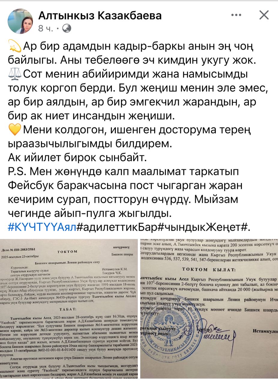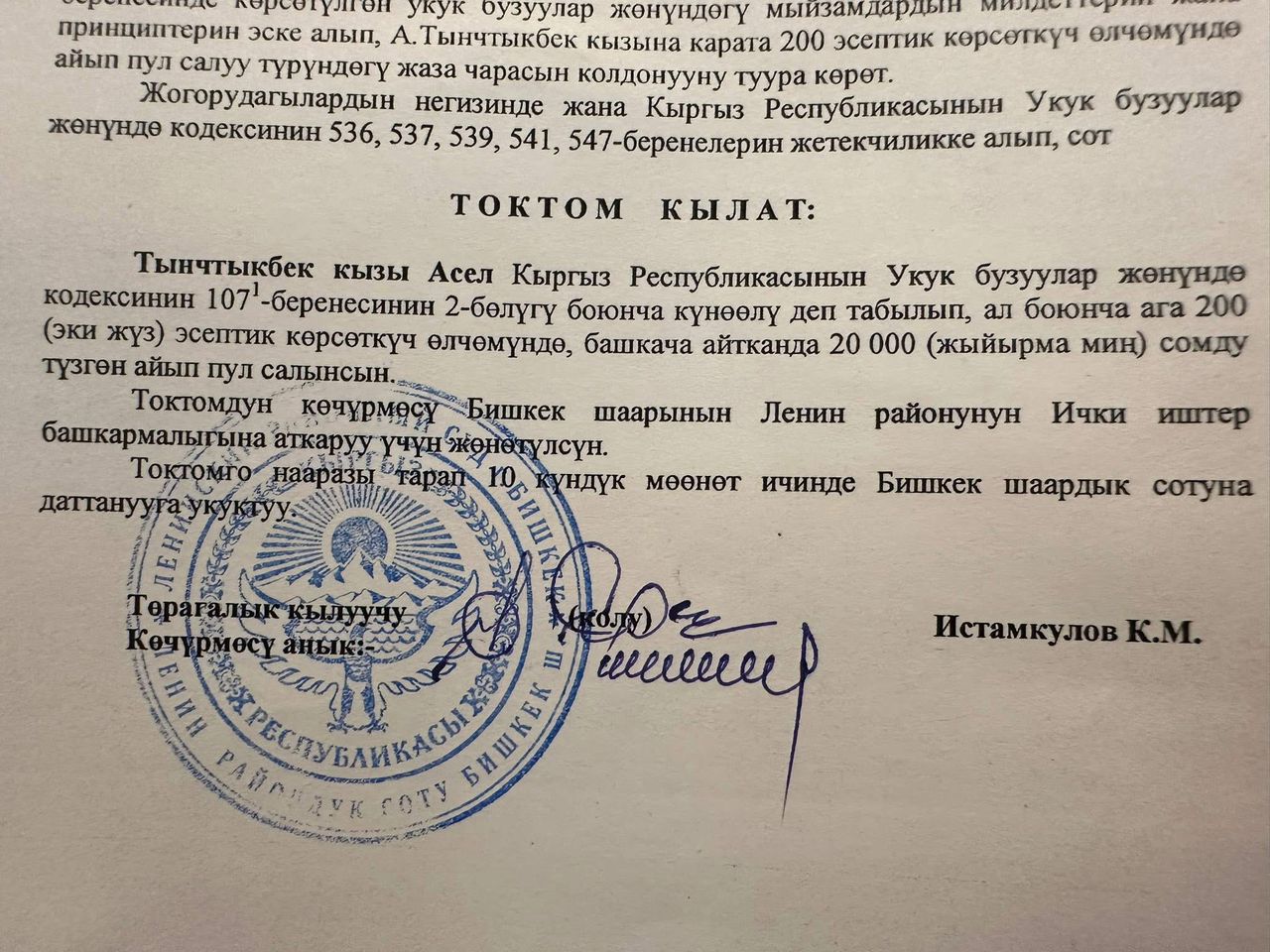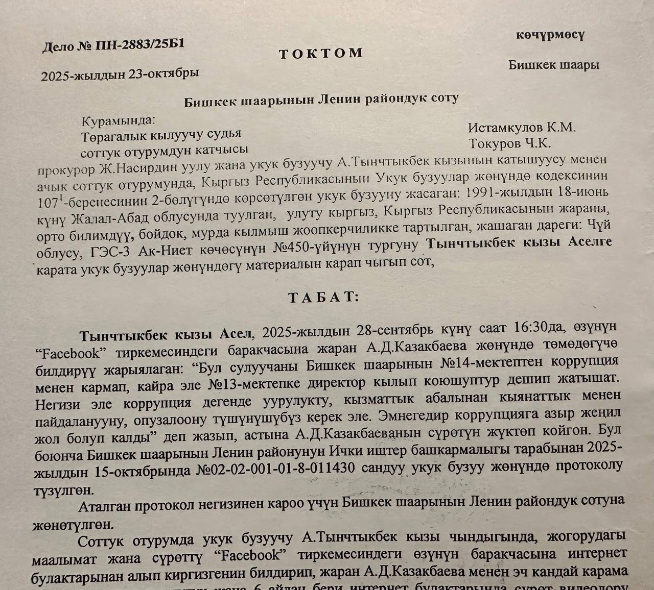Согласно документу, решение 23 октября вынес Ленинский районный суд Бишкека. В нем говорится, что Асель Тынчтыкбек кызы, 1991 года рождения, 23 сентября опубликовала пост, в котором написала, что гражданка А. Д. Казакбаева, работая в школе № 14, была задержана по обвинению в коррупции, а потом была назначена директором школы № 13.