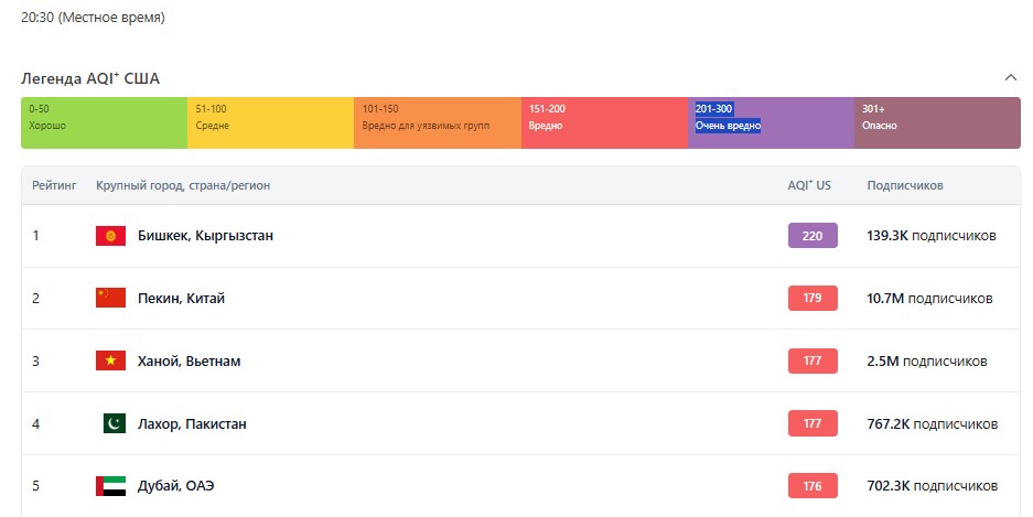Столица Кыргызстана накануне вечером снова возглавила топ городов с самым загрязненным воздухом. Об этом свидетельствуют данные портала IQAir, представляющего мониторинг качества воздуха в разных населенных пунктах мира.