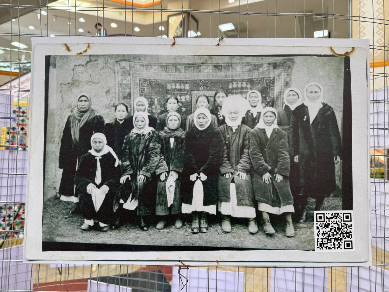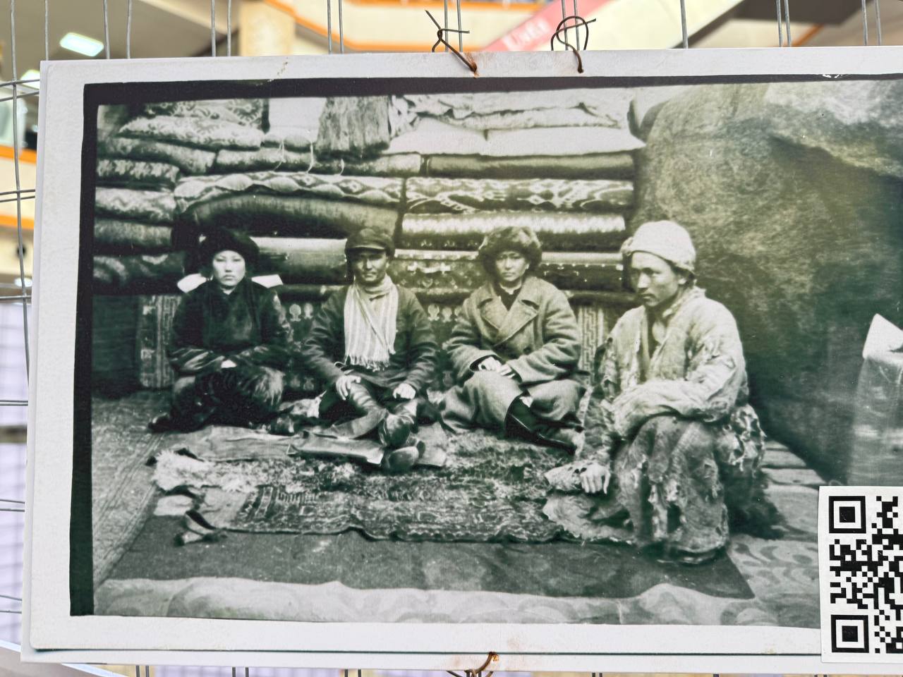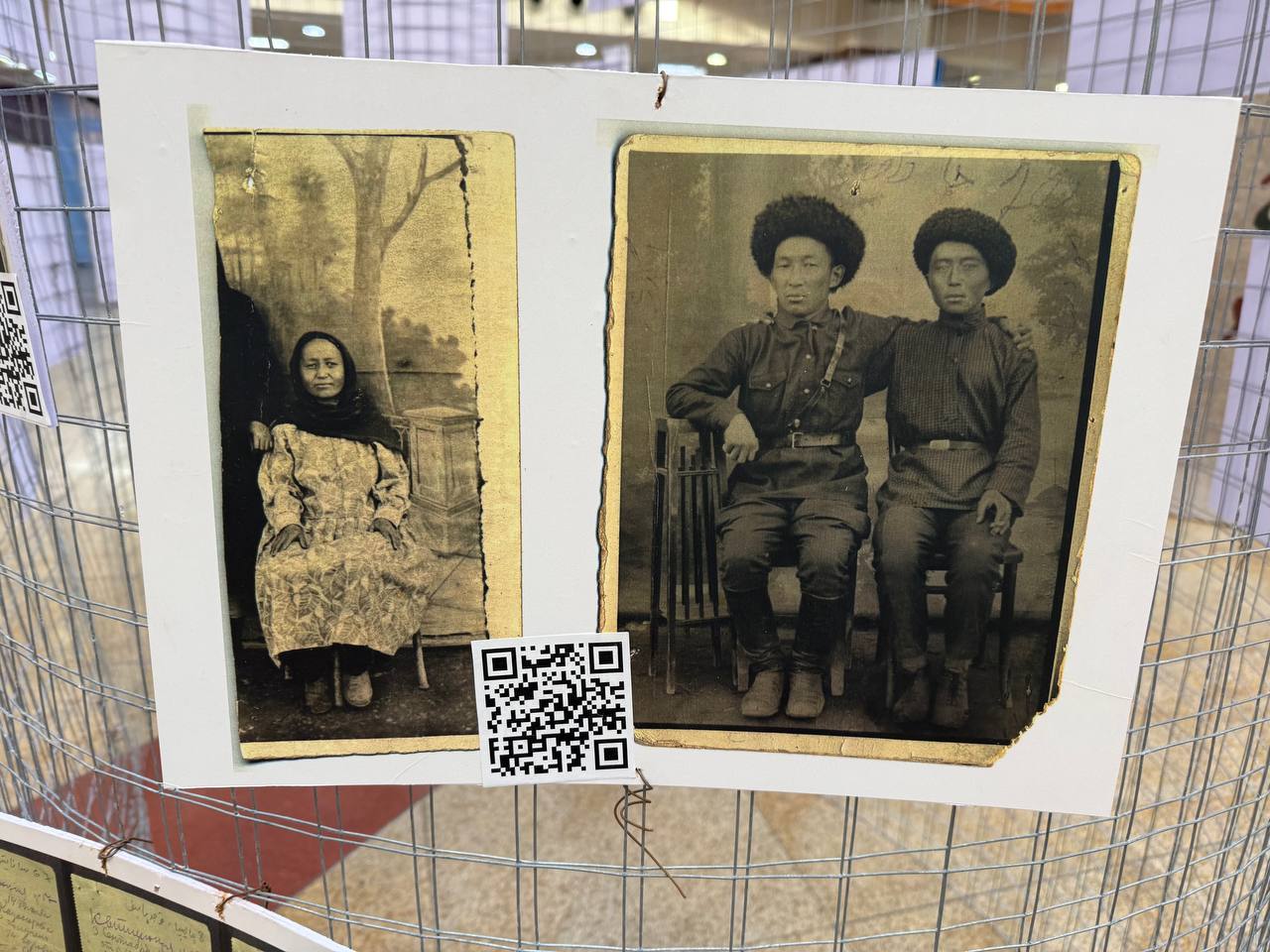 Сразу за полотном находится стенд с фотографиями, на которых запечатлены наши предки. Каждый может отсканировать QR-код с фото и перейти на специальную страницу проекта «Эсимде», позволяющую найти своего близкого родственника по имени или фамилии. Стоит отметить, что организаторы проделали большую работу, чтобы создать такую большую базу данных.