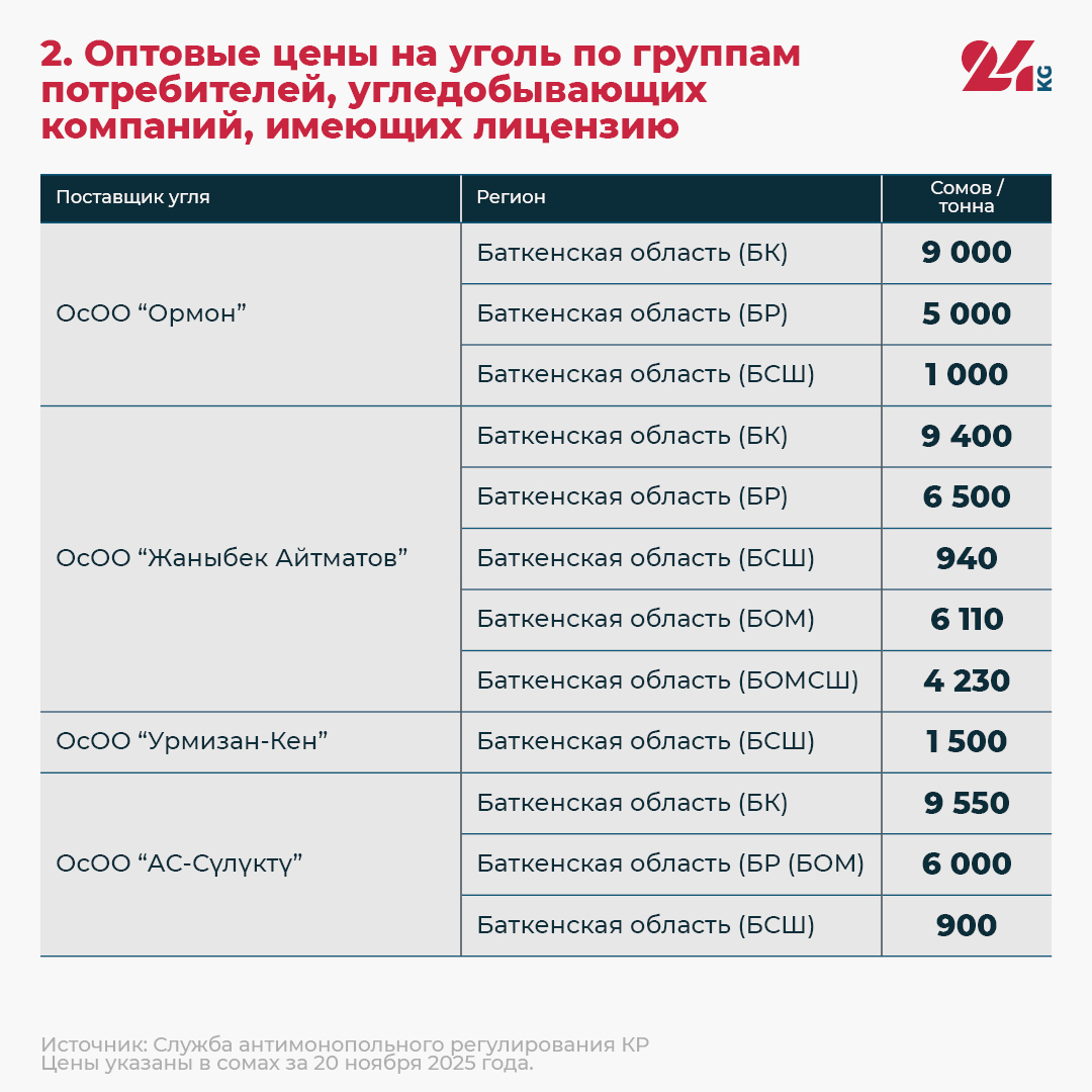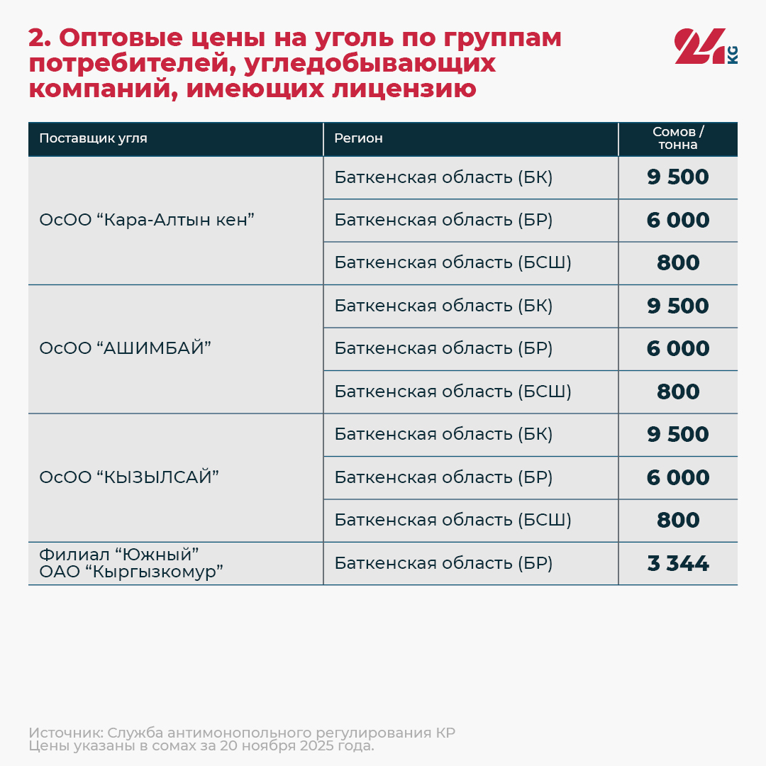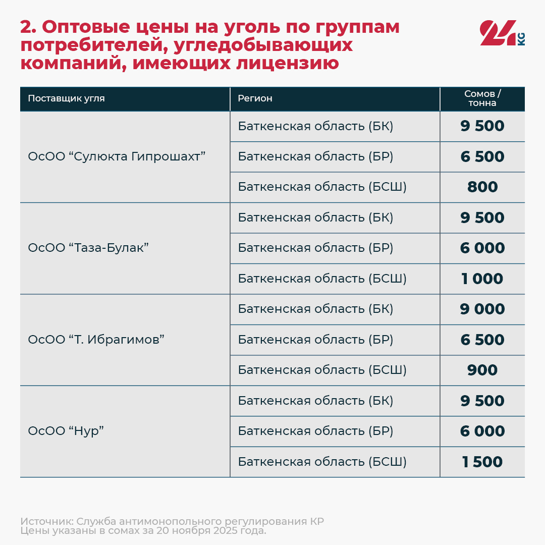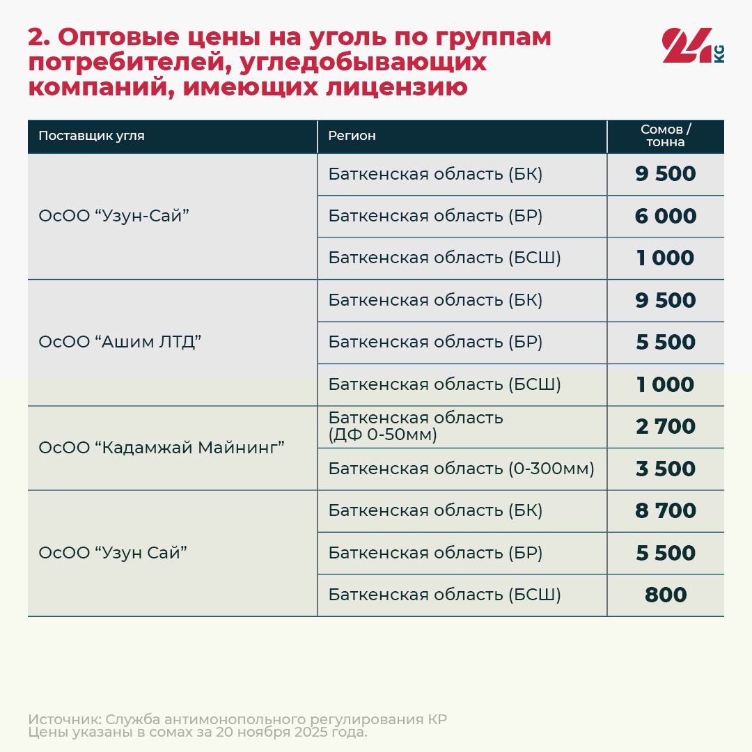 Кроме того, установили оптовые цены на реализуемый уголь по группам потребителей для угледобывающих компаний, имеющих лицензию: Антимонопольная служба утвердила оптовые цены для лицензированных компаний и тарифы на автоперевозку угля: от 3,0 до 3,99 сома за тонну-километр в зависимости от маршрута. Также служба установила цену мазута марки М-100 для поставок на Бишкекскую и Ошскую ТЭЦ — 21 тысяча 428 сомов за тонну без НДС и НСП.