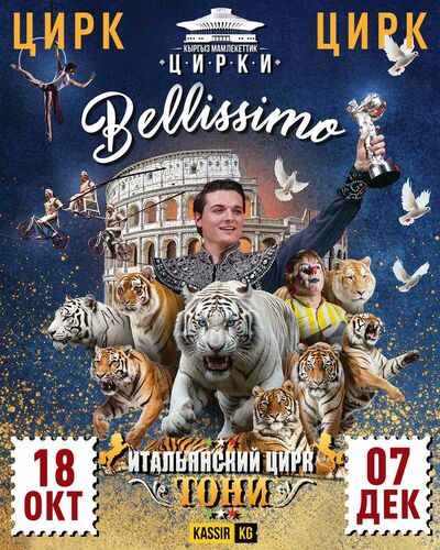 Из самого «сердца» Европы впервые в Кыргызстане выступит итальянский дуэт Флавио и Бруно Тони. Вас ждут уникальные розовые и белые тигры, воздушное импасато, смелые канатоходцы, полет акробатов под куполом цирка, жонглеры, ярчайшие попугаи и клоун из Латинской Америки.