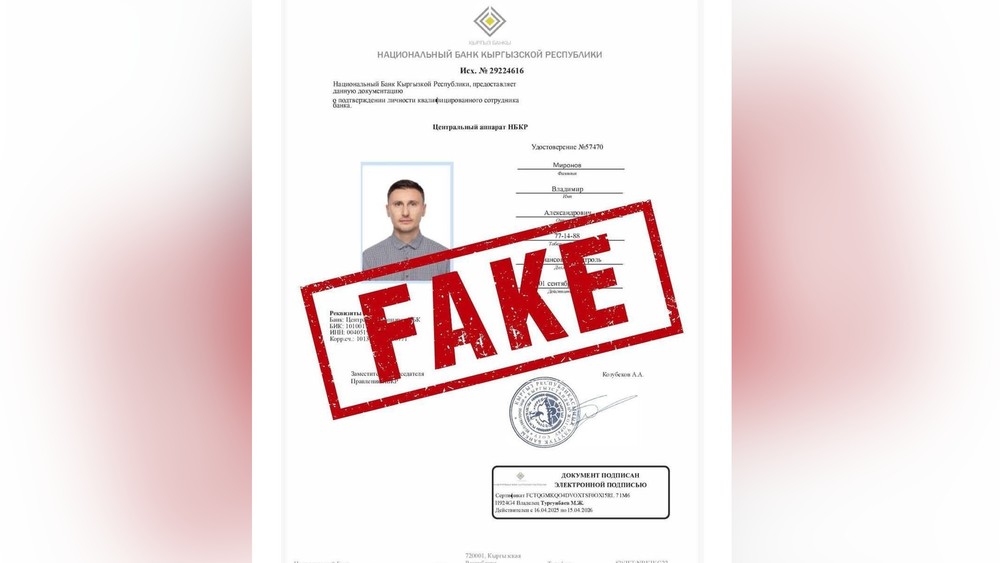 По его данным, для убедительности злоумышленники демонстрируют поддельные документы с логотипом Нацбанка и поддельной подписью заместителя председателя НБ КР.