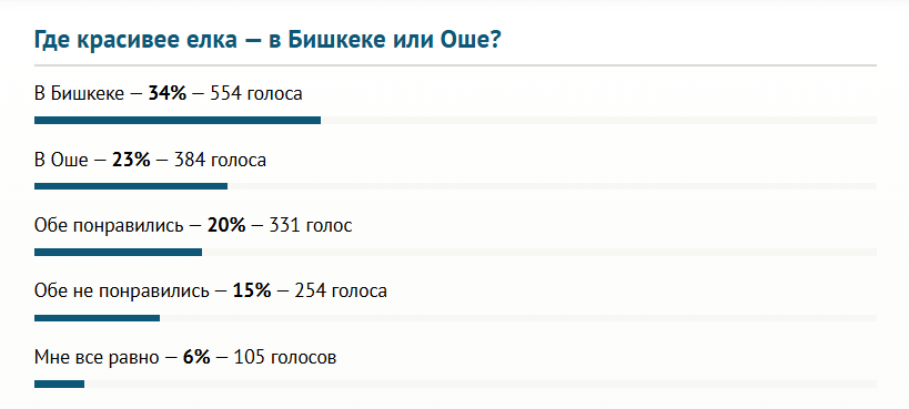 Согласно результатам, 34 процентам респондентов понравилась зеленая красавица в столице, 23 процентам — в Оше.