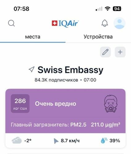 Статус города отмечен как «очень вредно». Индекс качества воздуха, по данным сайта, составляет 214 (AQI). В районе пересечения улицы Московской и бульвара Эркиндик он поднялся до 286 (AQI).