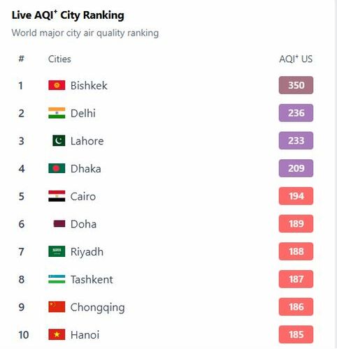 В рейтинге крупнейших городов мира по качеству воздуха World Air Quality на 16.40 Бишкек находится на первом месте.