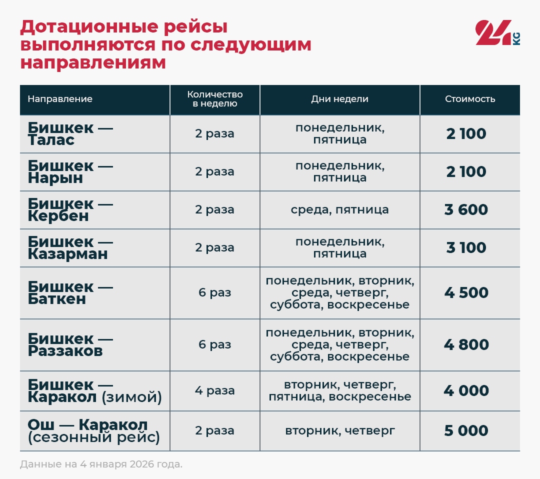 Отечественная авиакомпания Asman Airlines продолжает расширять программу дотационных авиаперевозок по внутренним направлениям Кыргызстана. С 4 января 2026 года перевозчик увеличил частоту полетов по ключевым маршрутам с фиксированными социально ориентированными тарифами, сообщила пресс-служба ОАО «Аэропорты Кыргызстана».