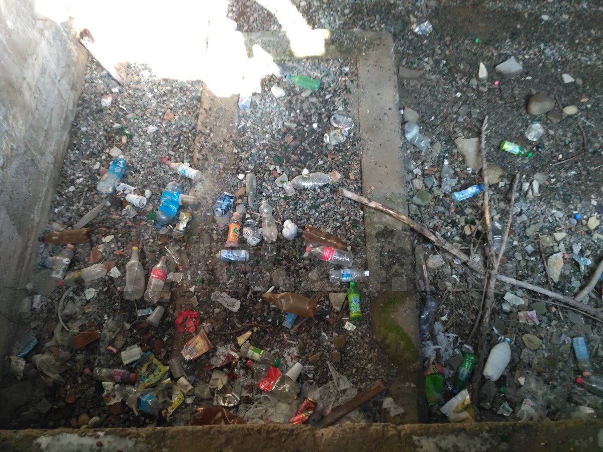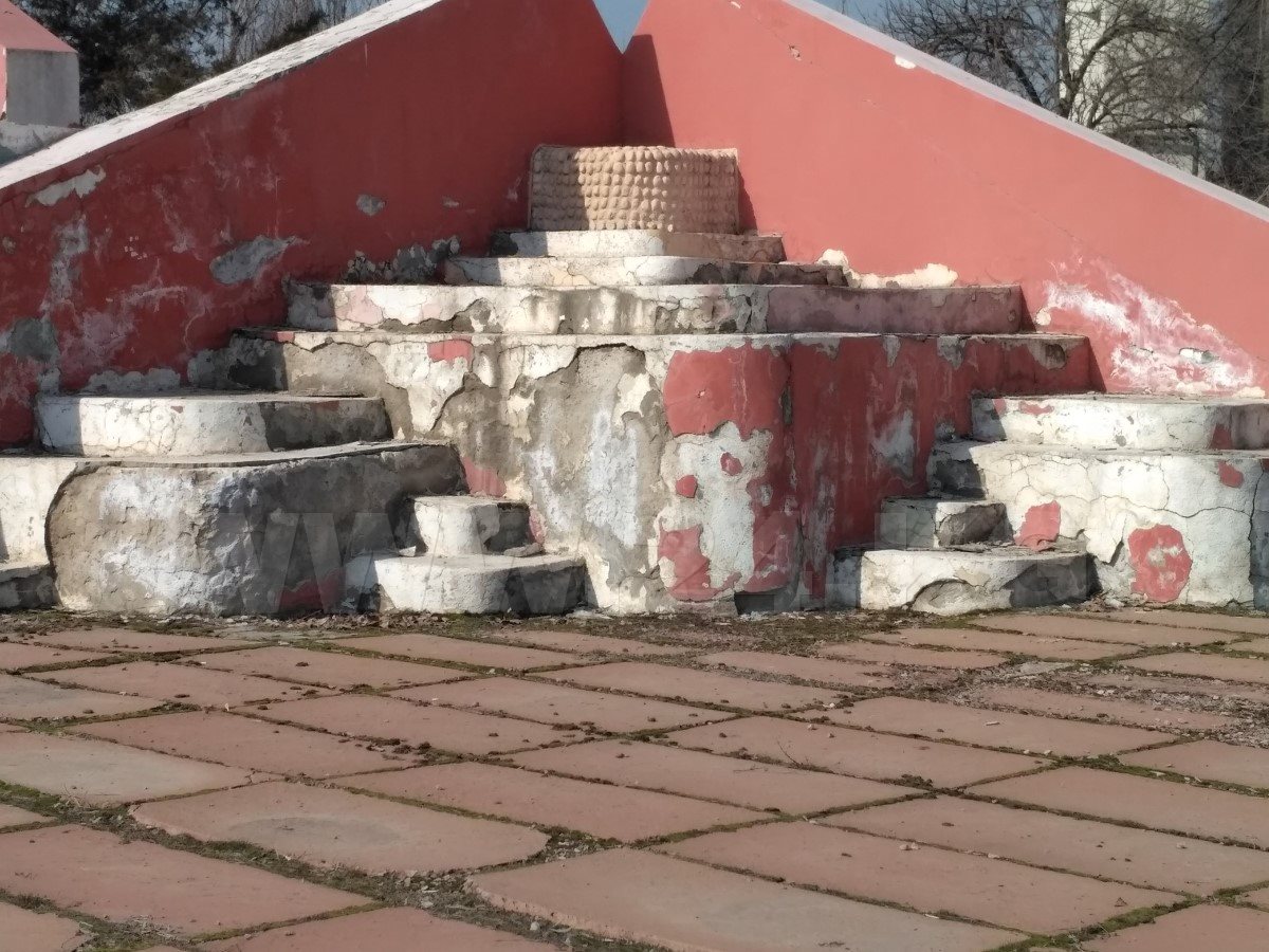 Почти у каждой архитектурной формы отваливается штукатурка, нет целых ступенек. Все они рассыпаются. Осыпается штукатурка и с башни. А имеющийся за ней подвал постепенно превращается в емкость для мусора.