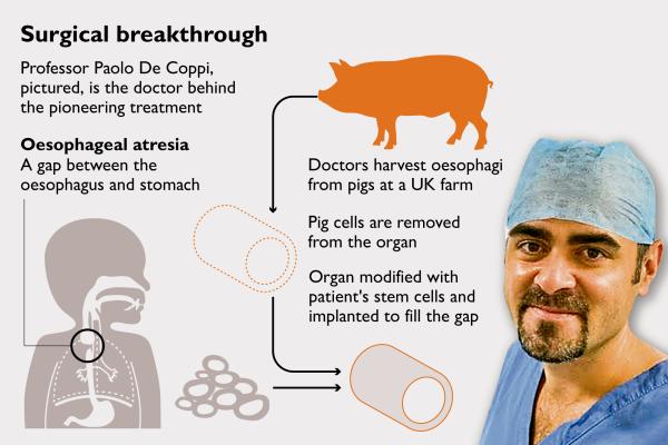 Отмечено, что детям, у которых отсутствует часть пищевода, планируется пересаживать свиные трансплантаты, модифицированные с помощью стволовых клеток ребенка. Соответствующие органы возьмут у свиней, выращенных на британских фермах. Они будут использоваться как каркас, в котором все клетки животного заменят стволовыми клетками новорожденного.