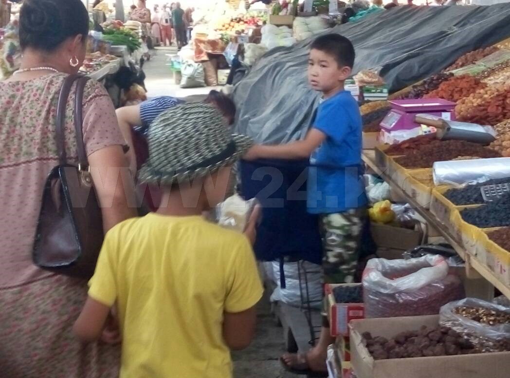 «Яблоки, виноград! Что желаете?» — не пропускает потенциального покупателя девчушка. Чаще всего школьники продают овощи, дыни, сухофрукты. Иногда стоят у прилавка с одеждой и мыломоющими средствами.