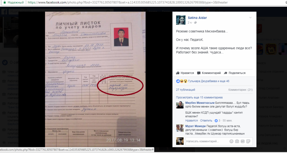 В социальной сети Facebook появилось фото личного листка по учету кадров Мээрбека Мискенбаева, недавно назначенного советником руководителя компании ЗАО «Альфа Телеком» («Мегаком»), бывшего депутата СДПК, руководителя организации «Айкол Ала-Тоо», членами которой являются пострадавшие во время апрельских событий.