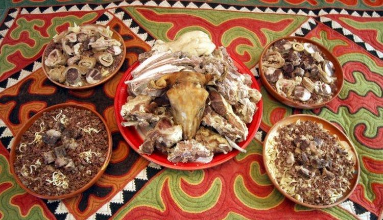 Подают блюдо с традиционными кыргызскими деликатесами из конины — чучук и казы карта.