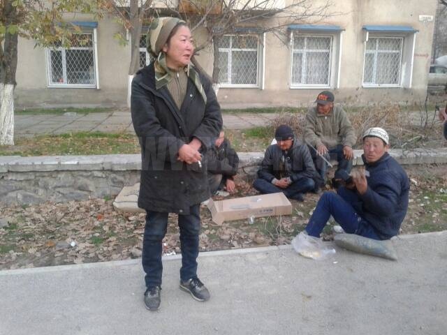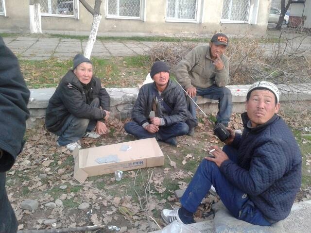 Видимо, зря все это время мы искали их на окраине и в укромных местах. Проезжая по недавно отремонтированной улице Турусбекова, мы увидели сидящих у тротуара десяток человек. Среди них одна женщина. Они выпивали и играли в карты.