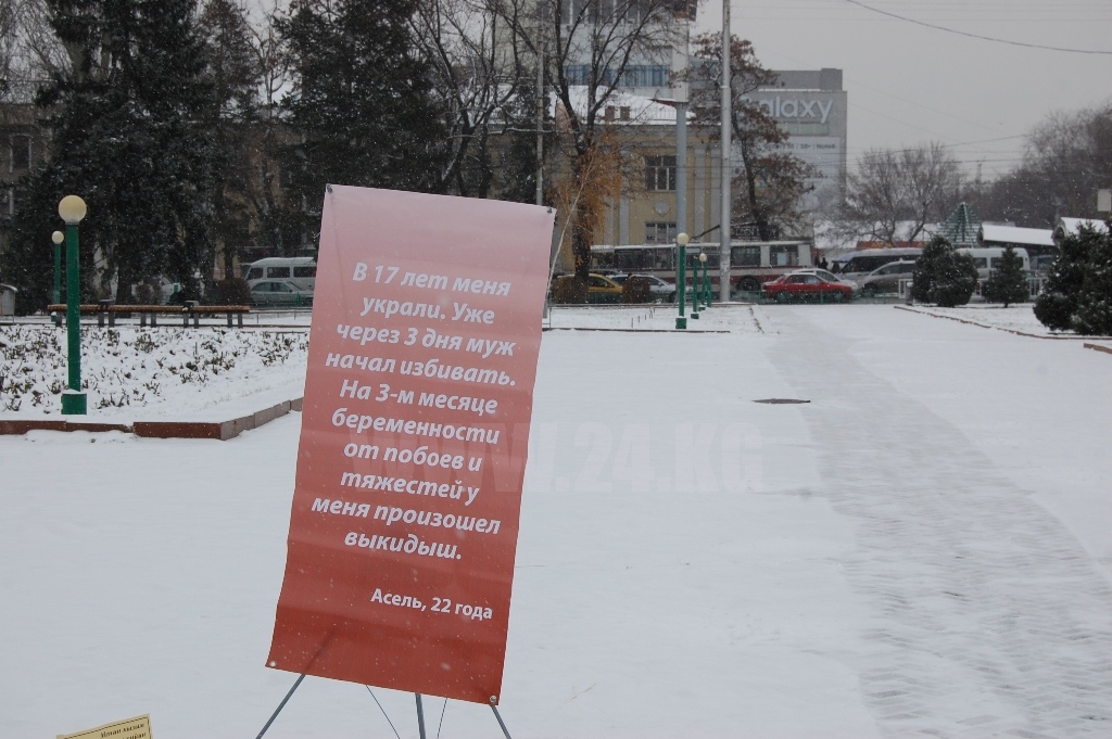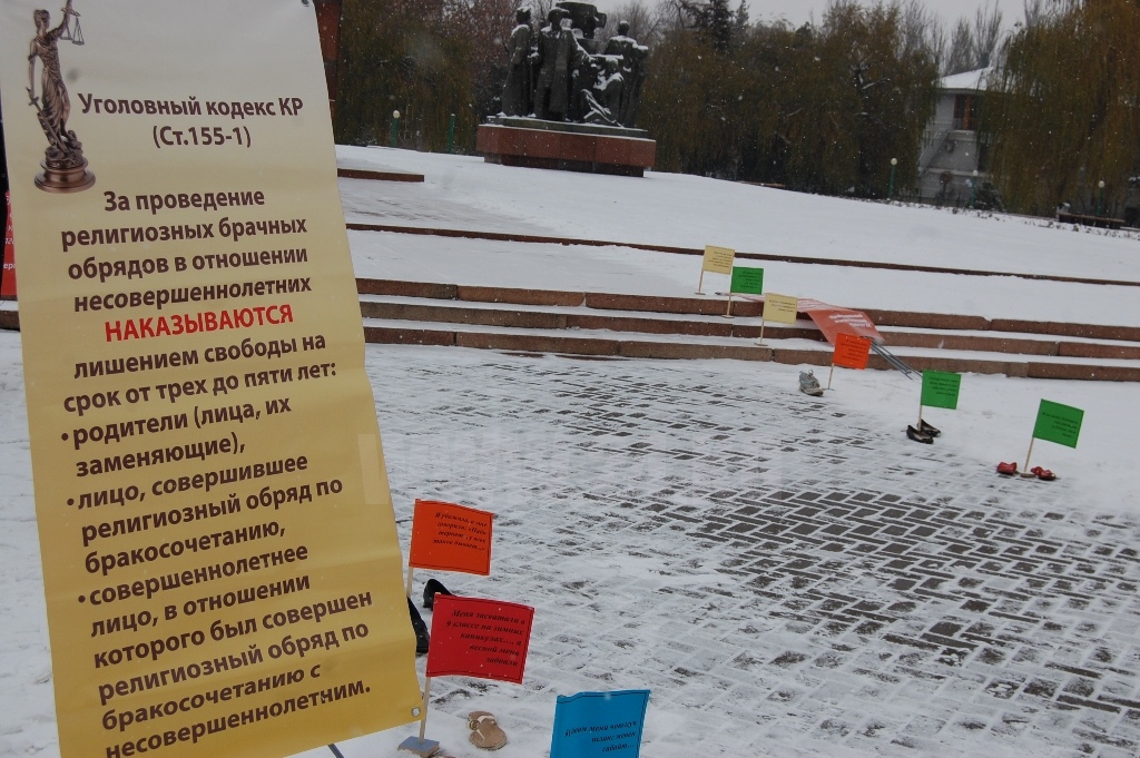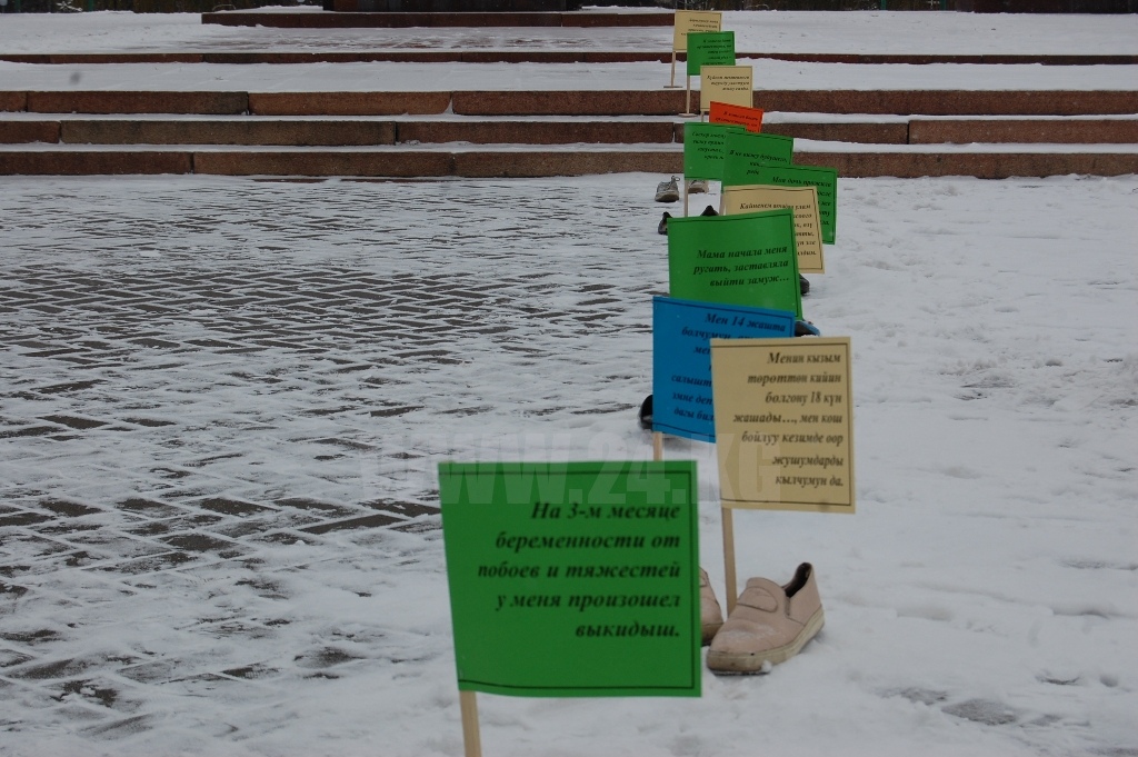 В сквере возле памятника организаторы обозначили дорожку флажками, на которых были написаны реальные истории женских потерь, рассказы о сломанных судьбах тех, кого слишком рано, по сути еще в детском возрасте выдали замуж. У каждого флажка поставили пару женской обуви как символ дороги, движения и, вероятно, возможного изменения ситуации. Участникам акции раздавали шарики и красные банданы.