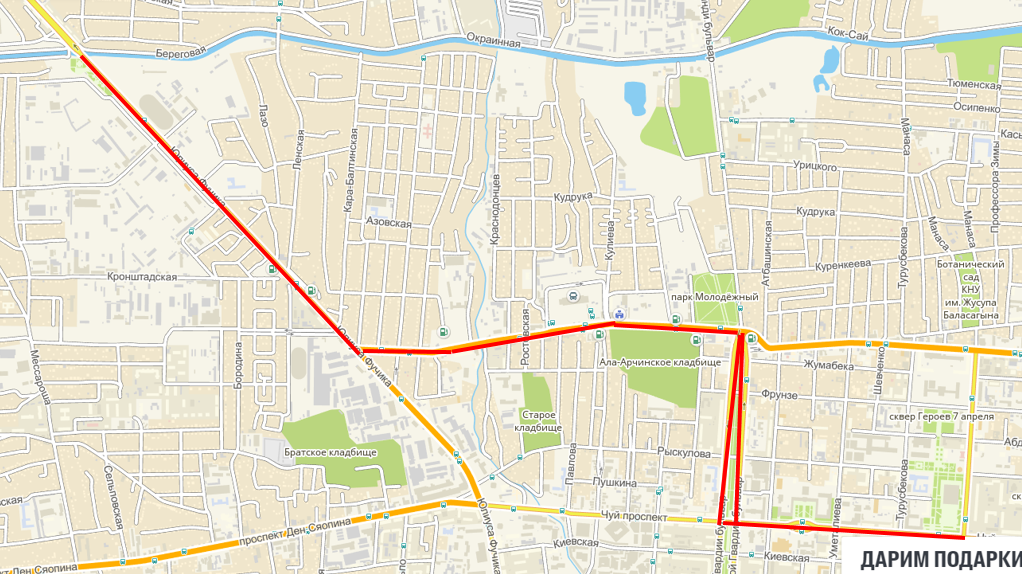 — на улице Фучика (от черты Бишкека до проспекта Жибек Жолу);