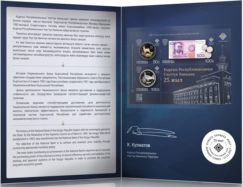 Общий тираж марок составил 5 тысяч экземпляров. Стоит отметить, что подпись на презентационном фолдере с марками оставил Кубанычбек Кулматов, который пробыл главой Нацбанка три месяца.