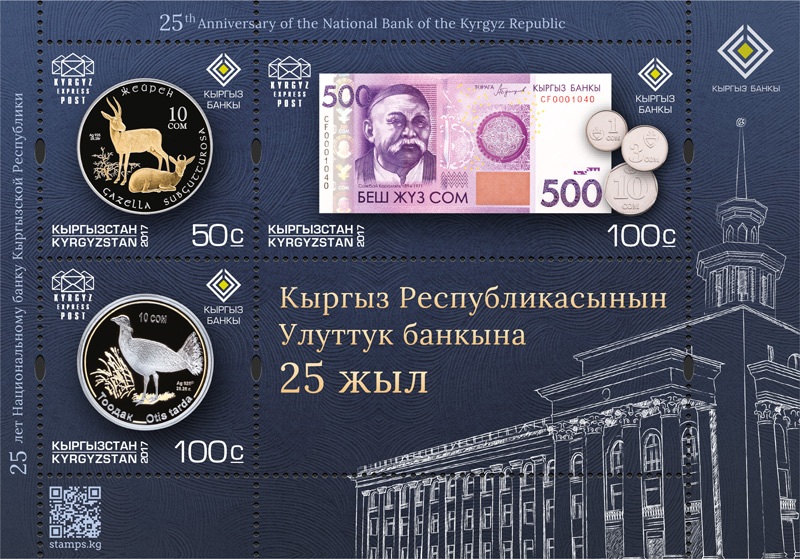Марки объединены в один марочный лист. Первый блок содержит марку номиналом 50 сомов с изображением коллекционной монеты «Джейран. Gazella subgutturosa» (2013 год). В втором блоке расположена марка номиналом 100 сомов с изображением коллекционной монеты «Дрофа. Otis tarda» (2015 год). В третьем блоке — марка номиналом 100 сомов с изображением банкноты номиналом 500 сомов (2016 год) и монет с номиналами 1, 3 и 10 сомов.