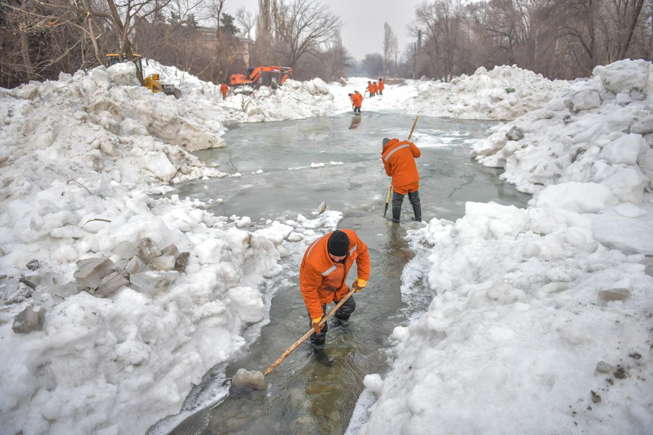 Сейчас на отдельных участках реки на улице Малдыбаева продолжаются очистительные работы по ликвидации снежных заторов и наледи. Постоянно работают 25 человек и шесть единиц спецтехники.