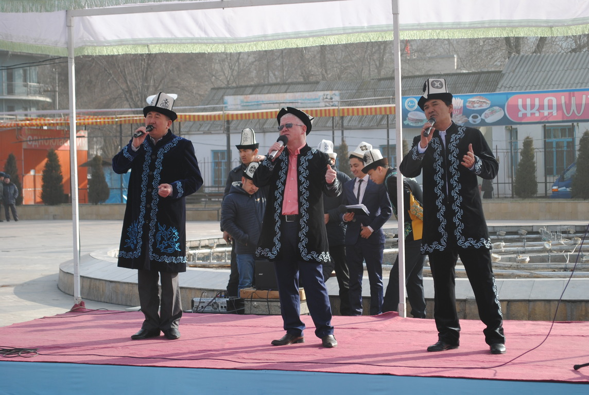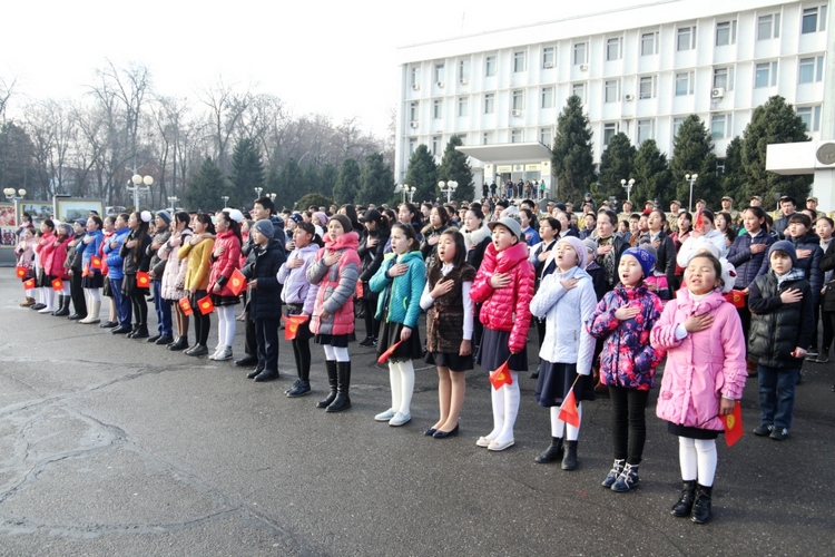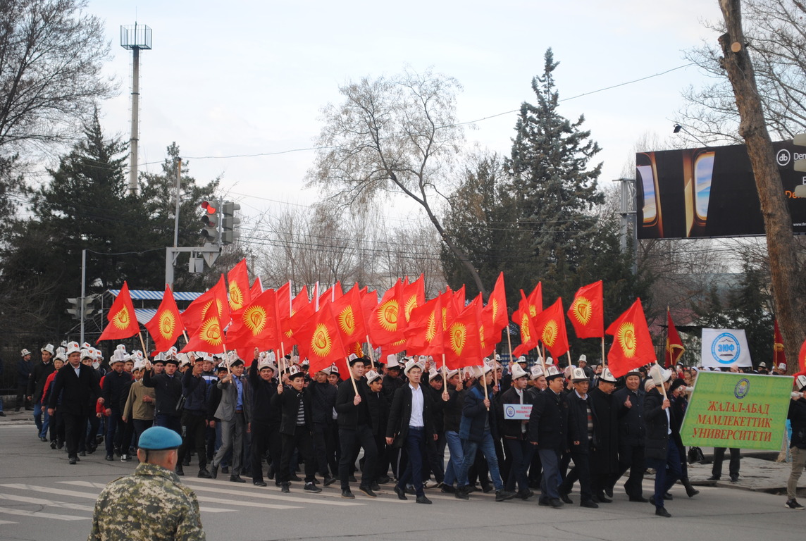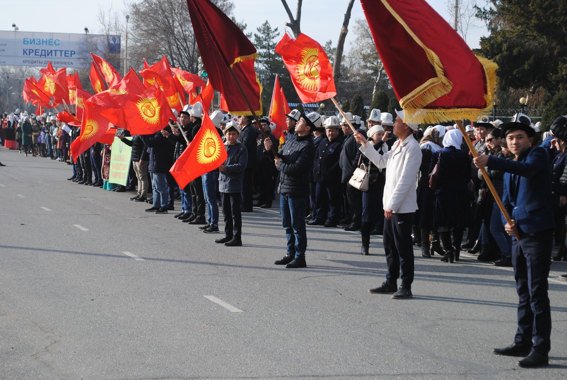 Более двух тысяч человек прошли по улицам, надев ак-калпаки и взяв в руки флаг Кыргызстана. Среди них были трудящиеся, студенты и преподаватели вузов и средних специальных учебных заведений и другие. Конечным пунктом маршрута стала центральная площадь, где прошел концерт.