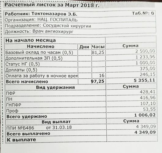 По его словам, ему известно, что высококвалифицированные медики получают не выше пяти тысяч сомов. У врача редкой категории, ангиохирурга из Нацгоспиталя Эльзара Токтоназарова, жалование 5 тысяч 535 сомов. Педиатр получает не выше четырех тысяч.