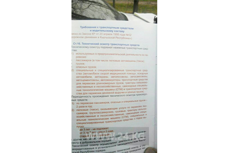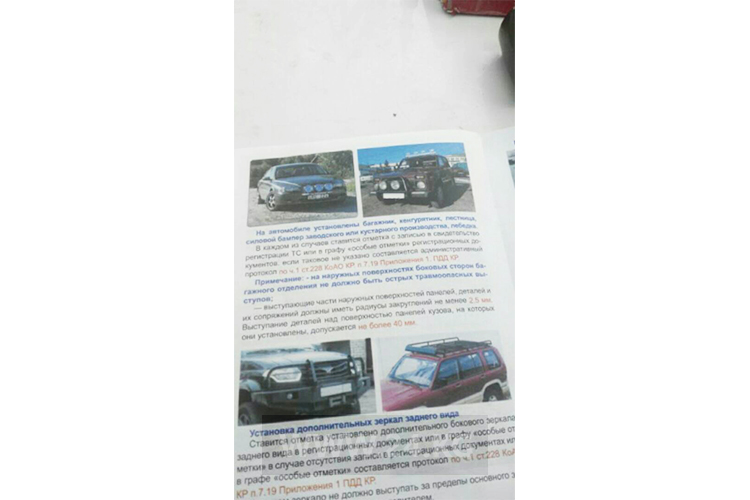 «Я купил автомобиль Mitsubishi Delica три года назад. Когда переоформлял ее, спрашивал в ГРС, все ли в порядке, не нужно ли ставить отметки в техпаспорте о дополнительном оборудовании. Специалисты осмотрели машину и сказали, что все нормально. Но недавно меня остановили сотрудники ГУОБДД на посту по дороге в аэропорт «Манас» и сказали, что у меня должна быть отметка в техпаспорте о «кенгурятнике» и противотуманных фарах. Показали книжку, в которой написано, что на такое оборудование даже заводского производства нужна отметка. После долгих переговоров меня отпустили, но сказали, что в следующий раз обязательно «оформят», — сообщил ИА «24.kg» читатель.