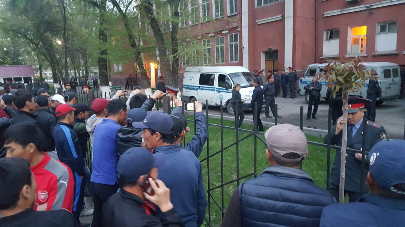 Митингующие жители Тогуз-Тороуского района Джалал-Абадской области пришли к зданию Первомайского районного суда в Бишкеке.