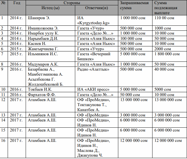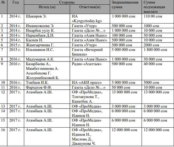 «Начиная с 2017 года суды в большинстве случаев не соблюдают требования разумности и справедливости. Если раньше они удовлетворяли лишь малую часть запрашиваемой истцами суммы, то в исках о защите чести и достоинства экс-президента Алмазбека Атамбаева, запрашиваемые суммы удовлетворялись в полном объеме. При этом минимальная сумма, взыскиваемая с одного ответчика в рамках одного иска, составляла не менее 3 миллионов сомов, то есть в десятки, а то и в сотни раз больше, чем те суммы, которые были взысканы ранее», — говорится в отчете.