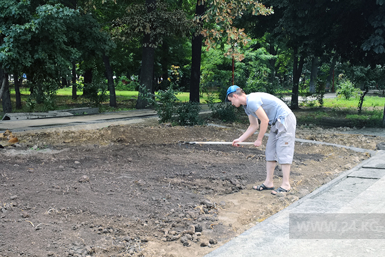 Близки к завершению и работы в парке Фучика. На скамеечках уже можно видеть отдыхающих. Некоторые держат в руках медицинские карты — рядом больница. Здесь, как говорится, осталось навести лоск: сотрудники Бишкекзеленхоза завезли землю, проводят санитарную обрезку сухих ветвей. Кое-где надо поправить брусчатку. В верхней же части парка работ намного больше. На помощь позвали местных жителей.